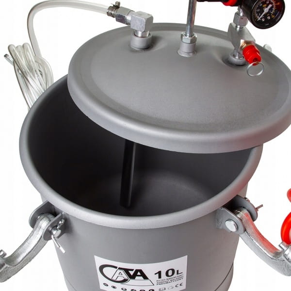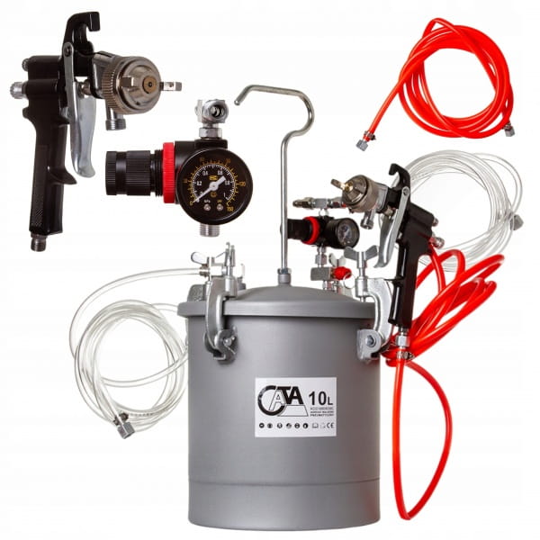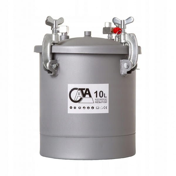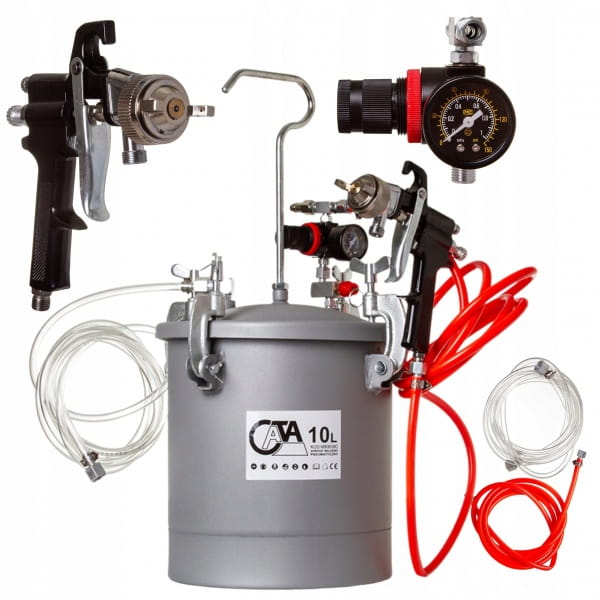 Idealny do malowania dużych powierzchni. Zestaw posiada zbiornik 10l, na pokrywie którego mocowany jest reduktor ciśnienia, z manometrem i zaworem bezpieczeństwa. Do pistoletu lakierniczego farba podawana jest pod ciśnieniem i tam rozpylana jest przy pomocy sprężonego powietrza. Ciśnieniowy agregat malarski idealnie sprawdzi się przy malowaniu dużych powierzchni i nie tylko. Profesjonalny i kompaktowy agregat malarski firmy CATA idealnie nadaje się do wszelkich prac wykończeniowych przy malowaniu ścian, sufitów etc. oraz do prac lakierniczych. Dzięki swoim kompaktowym rozmiarom, elastycznym wężykom oraz wytrzymałemu zawiesiu, zestaw sprawdza się w pracy mobilnej, na wysokościach czy platformach. Agregat pracuje z szeroką gamą lakierów oraz farb bez rozpuszczalników takich jak farby akrylowe, kleje kontaktowe, bejce, tapety natryskowe, emulsje etc.