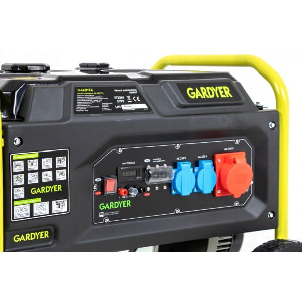 W zestawie znajdują się trzy gniazda: jedno 3-fazowe oraz dwa 230 V AC 1-fazowe, co pozwala na podłączenie różnorodnych urządzeń i narzędzi. Zbiornik paliwa o pojemności 25 l zapewnia nieprzerwany czas pracy na poziomie 10 godzin przy 50% obciążenia, co jest szczególnie ważne w przypadku pracy w terenie bez dostępu do zasilania sieciowego. Agregat Gardyer G5600T został wyposażony w rozrusznik ręczny, który zapewnia szybki i niezawodny start urządzenia w każdych warunkach.