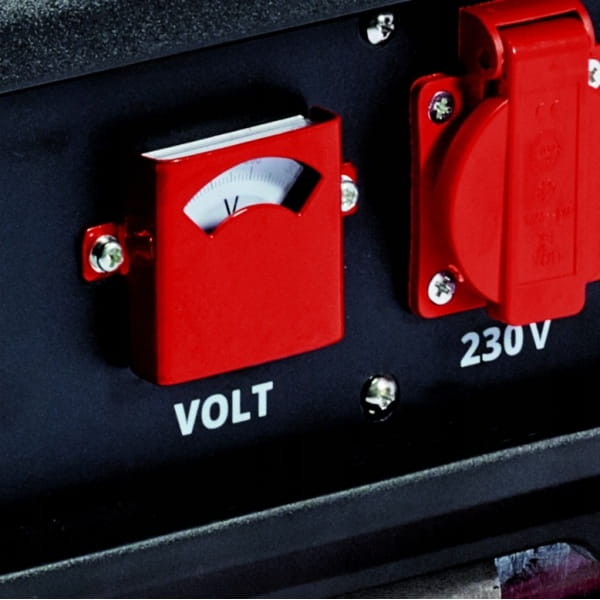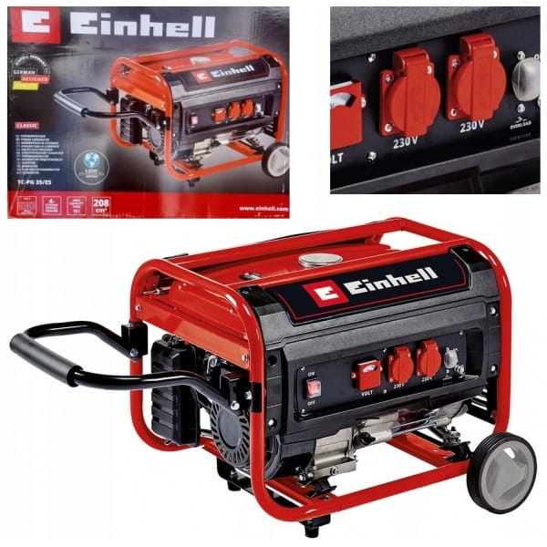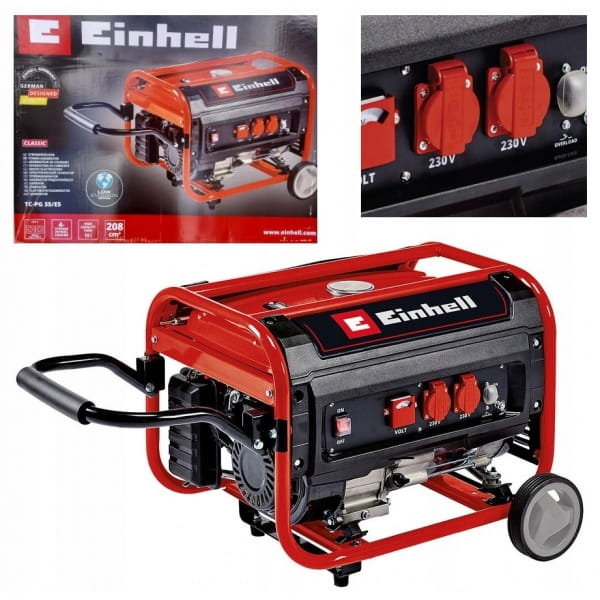 Agregat prądotwórczy Einhell TC-PG 35/E5 generuje 2600 watów ciągłej mocy i maksymalną moc 3100 watów dzięki mocnemu i solidnemu 4-suwowemu silnikowi napędowemu. Zgodność z przepisami Emission 5 gwarantuje, że chłodzony powietrzem czterosuwowy silnik benzynowy pracuje z niską emisją. Do przetworzenia energii elektrycznej na urządzenia końcowe dostępne są dwa gniazda 230V wraz z woltomierzem wskazującym napięcie. Funkcja AVR (Automatic Voltage Regulation) zapewnia stabilną moc wyjściową. Dwa duże koła i składana rączka zapewniają łatwe przenoszenie. Duży 15-litrowy zbiornik jest wyposażony w praktyczny wskaźnik poziomu do ciągłej pracy. Wyłącznik przeciążeniowy oraz zabezpieczenie przed niedoborem oleju zapewniają bezpieczną i długotrwałą pracę. Agregat prądotwórczy uruchamia się w bardzo prosty sposób za pomocą linki.
