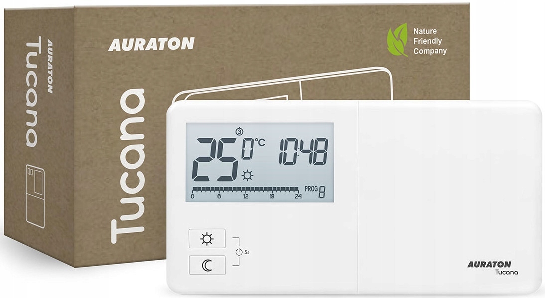 Tygodniowy, przewodowy regulator temperatury wyposażony jest w licznik czasu pracy urządzenia grzewczego. AUARTON Tucana umożliwia użytkownikowi zarządzanie 7 niezależnie konfigurowalnymi programami, przy 4 niezależnie ustawialnych temperaturach – dziennej nocnej, przeciwzamrożeniowej, urlopowej. Wyświetlacz LCD posiada 3 kolory podświetlenia do wyboru i dostosowany jest do pracy w słabo oświetlonych pomieszczeniach. Regulator temperatury wyposażony jest w tryb pracy PWM, polegający na cyklicznym załączaniu