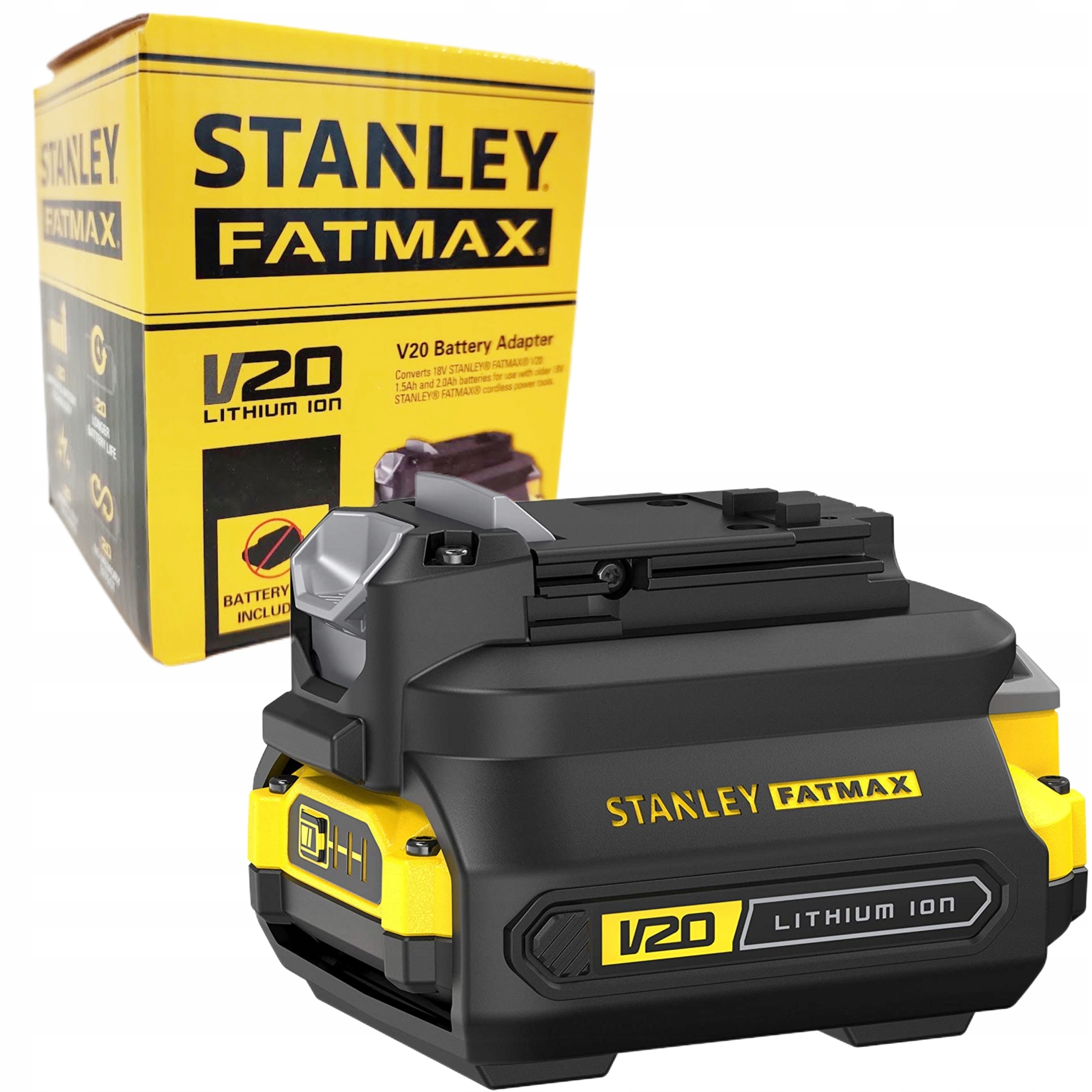 Adapter do akumulatorów SFMCB100-XJ Stanley Fatmax to narzędzie pozwalające wykorzystać nowe akumulatory 1,5 oraz 2.0 Ah z serii 20V w urządzeniach akumulatorowych klasycznej serii 18V.