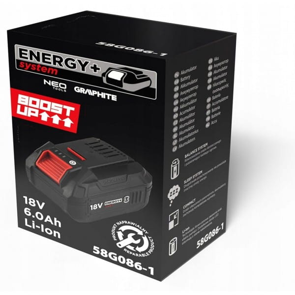 Akumulator Energy+ 18 V Li-Ion 6 Ah BOOST UP 58G086-1 GRAPHITE to akumulator litowo-jonowy o zwiększonej pojemności BOOST UP, przystosowany do wielu urządzeń z serii Energy+. Bezpieczne ogniwa posiadają pojemność 6 Ah oraz 18 V napięcia znamionowego. Wskaźnik naładowania pozwala lepiej rozplanować pracę, natomiast elektroniczny system kontroli temperatury i przepływu prądu czyni akumulator serii ENERGY+ bezpiecznym wyborem. Akumulator należy ładować za pomocą wybranych ładowarek do akumulatorów Energy+ GRAPHITE. Urządzenia z serii Energy+ to doskonała propozycja dla profesjonalistów oraz majsterkowiczów.