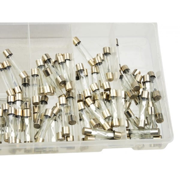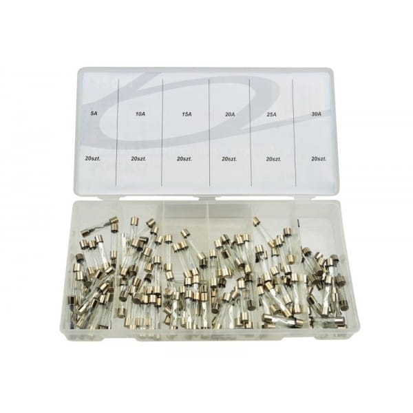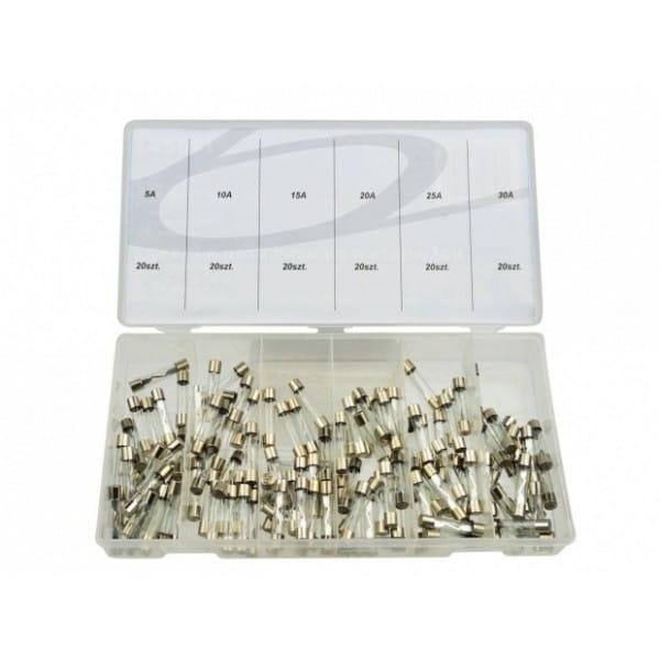 Zestaw bezpieczników szklanych 120szt. marki GEKO. Bezpieczniki zapakowane w małe plastikowe pudełko z przegródkami, po 20 bezpieczników w każdej.