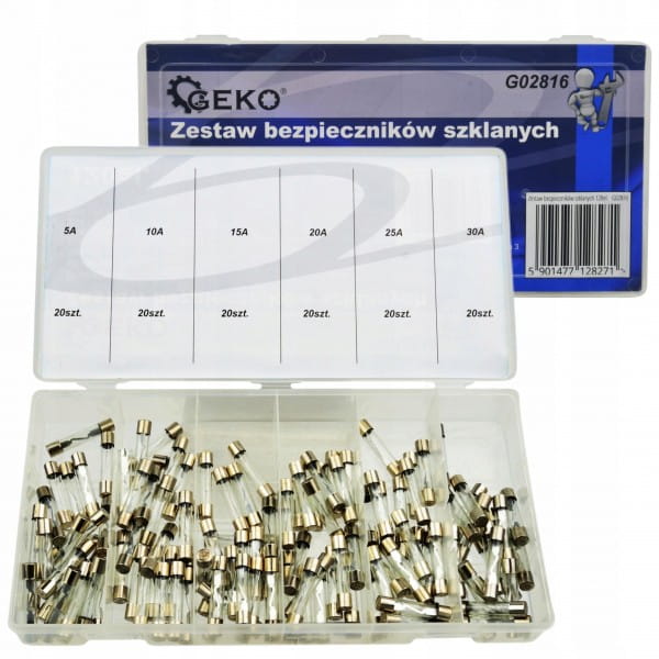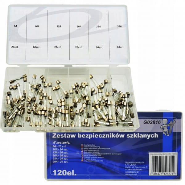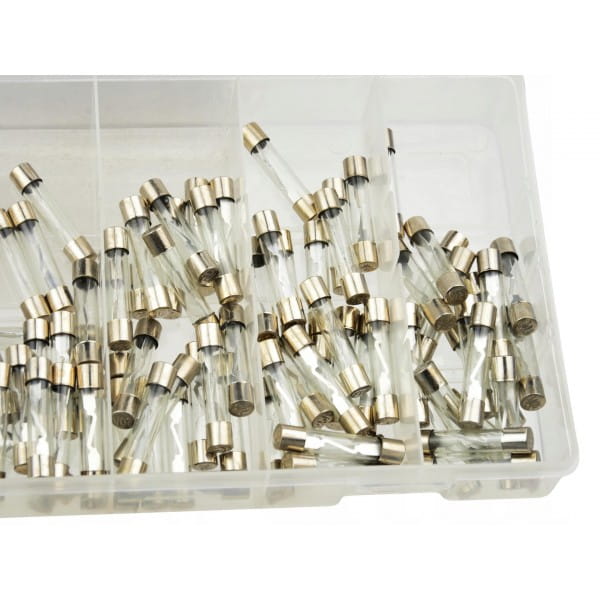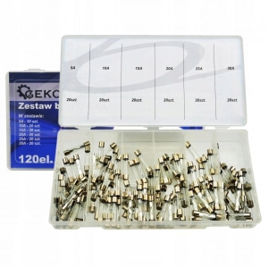 Zestaw 120 bezpieczników szklanych o 6 różnych natężeniach prądu od 5A do 30A.