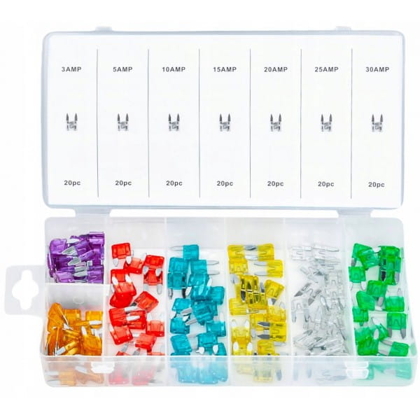 Zestaw zapakowany w praktyczne wygodne pudełko umożliwiające porządkowanie bezpieczników według ich mocy.