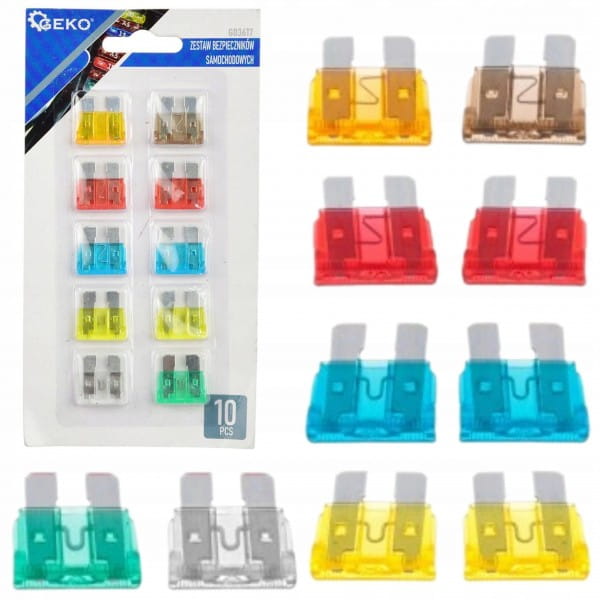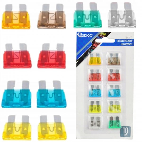 W zestawie 10 sztuk bezpieczników samochodowych. W zestawie znajduje się 7 rodzajów bezpieczników o natężeniu od 5A do 30A. Zunifikowane kolory bezpieczników odpowiadają konkretnym natężeniom.