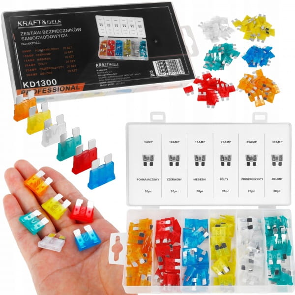 ZESTAW BEZPIECZNIKÓW BEZPIECZNIKI SAMOCHODOWE 120SZT. 5-30A KRAFT&DELE