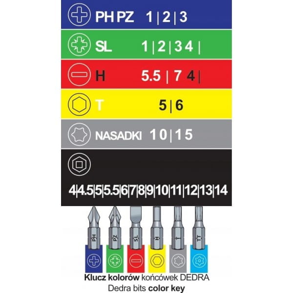 Zestaw 30 szt końcówek wkrętakowych i nasadek. W skład zestawu wchodzą Końcówki PH, PZ, SL, H, T oraz nasadki wraz z grzechotką. Końcówki wykonane zostały ze stali S2, która cechuje się wysoką hartownością oraz odpornością na uderzenia. Dzięki odpowiedniemu składowi chemicznemu i obróbce cieplnej, końcówki na długo zachowują swoje wysokie właściwości wytrzymałościowe. Całość zamknięta w poręczne plastikowe pudełko.