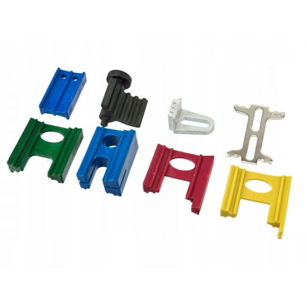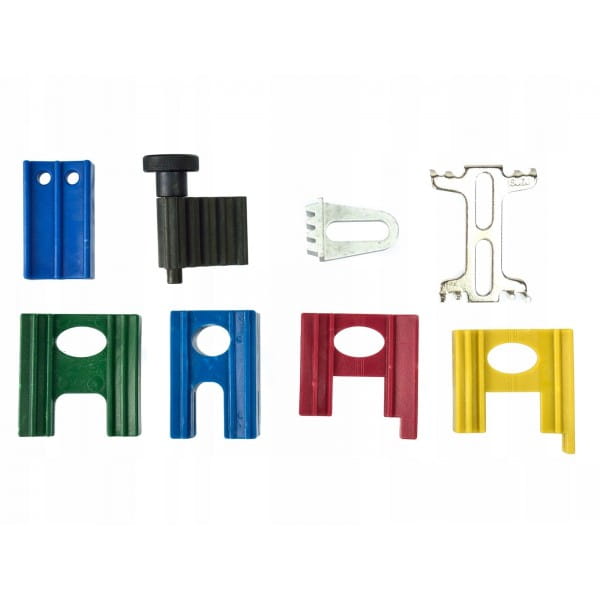 Konstrukcja: zestaw składa się z 8 blokad, umożliwia unieruchomienie kół zębatych rozrządu w pozycji serwisowej podczas wymiany paska rozrządu; specjalny kształt blokad pozwala na precyzyjne ustawienie punktów kontrolnych zapłonu; blokady unieruchamiają koło (koła) zębate rozrządu i wału korbowego.
