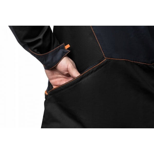 Wysoka stójka dobrze ochrania szyję przed warunkami atmosferycznymi. Suwak główny jest estetycznie schowany w plisie zapinanej na napy, a profilowane rękawy pozostawiają potrzebną swobodę podczas pracy i umożliwiają regulację obwodu oraz dopasowanie do indywidualnych wymiarów.
