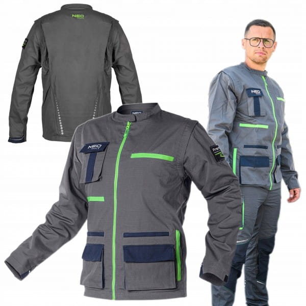 Bluza robocza PREMIUM NEO wykonana w 100% z bawełny to dedykowane do wszelkich prac zawodowych jak i domowych. Została wykonane z tkaniny ripstop, która blokuje dalsze rozdzieranie ubrania, gdy zostanie ono uszkodzone mechanicznie. Bluzę dzięki odpinanym rękawom można zmienić w kamizelkę. Bluza ma stójkę, specjalne zakładki na plecach oraz regulację obwodu nadgarstka dzięki czemu zapewnia swobodę ruchów. Aby pomieścić różne narzędzia bluza została zaopatrzona w wielofunkcyjne kieszenie zapisane na suwaki i napy. Odblaskowe elementy bluzy zapewniają widoczność i bezpieczeństwo o każdej porze dnia oraz w różnych warunkach pogodowych. Posiadają certyfikat CE na zgodność z normą EN ISO 13688:2013.