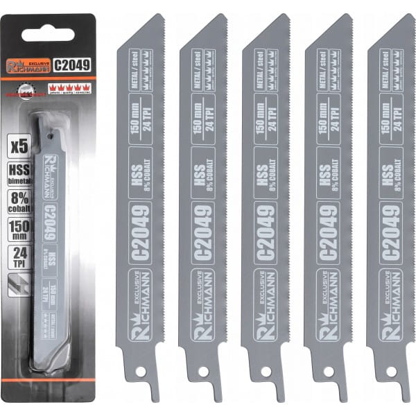 Zestaw 5 szt. brzeszczotów HSS bimetal o długości 150 mm przeznaczonych do pił szablastych.