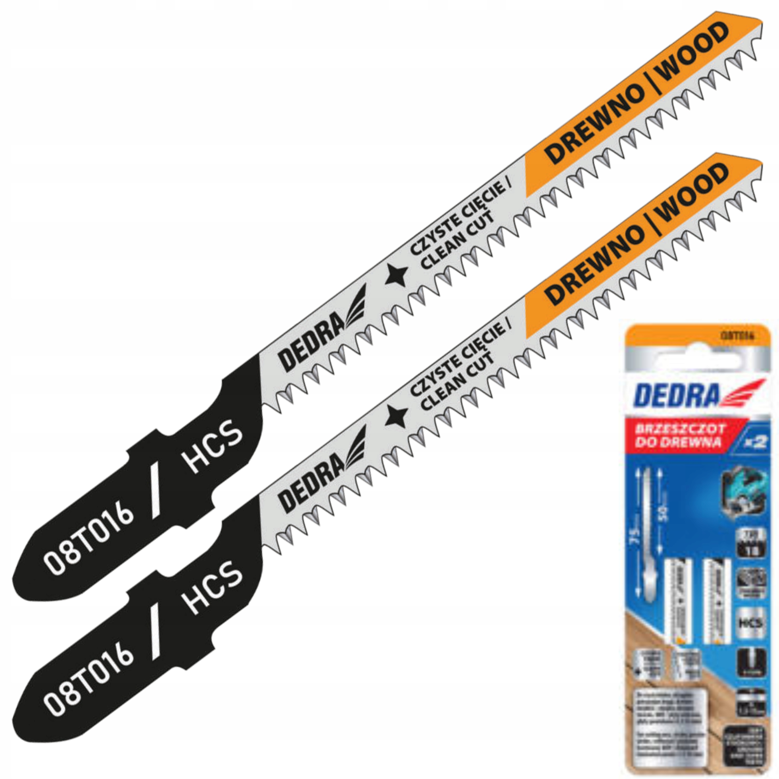 Brzeszczot do wyrzynarki do drewna DEDRA 08T016 przeznaczony jest do precyzyjnego, czystego cięcia. Brzeszczot sprawdzi się doskonale w cięciu krzywoliniowym, wycinaniu łuków, okręgów, czy precyzyjnych kręgów. Przeznaczony do cięcia miękkiego drewna, sklejki, drewna twardego, płyt MDF, płyt powlekanych, płytach wiórowych o grubości 1-15mm. Brzeszczot charakteryzuje się długością maksymalną 75mm, a długość robocza to 50mm. Wykonany ze stali wysokowęglowej HCS. Skuteczne cięcie zapewnia odpowiednio przygotowana powierzchnia tnąca, czyli szlifowane stożkowo zęby o zagęszczeniu 18TPI (18 zębów na cal)