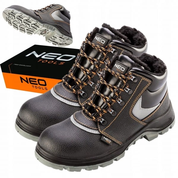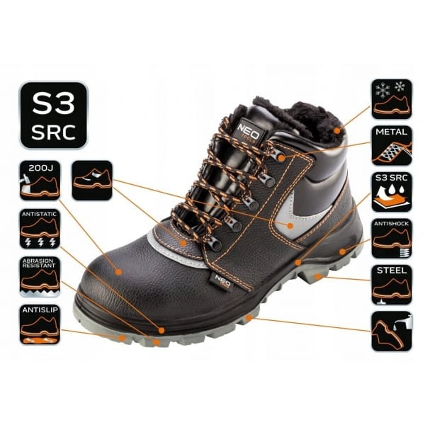 Skórzane, ocieplane trzewiki robocze to produkt należący do kategorii obuwia bezpiecznego S3 SRC wg normy EN ISO 20345. Trzewiki NEO przeznaczone są do ochrony stóp użytkownika przed urazami. Wyposażone są w stalowe podnoski zaprojektowane tak, aby zapewniały ochronę przed uderzeniami z energią równą 200J i przed ściskaniem równym 15kN, antypoślizgową podeszwę odporną na: ścieranie (z systemem absorbującym wstrząsy), oleje, benzynę i inne rozpuszczalniki organiczne, odporną na poślizg na podłożu ceramicznym pokrytym roztworem laurylosiarczanu sodu (SLS) i na podłożu ze stali pokrytym glicerolem. Obuwie posiada zintegrowaną wkładkę antyprzebiciową, zabezpieczającą przed przebiciem od podłoża oraz wkładkę antyelektrostatyczną. Ich wodoodporność podnosi komfort pracy w trudnych warunkach a ocieplenie ekologicznym futrem umożliwia prace w niskich temperaturach. Wyrób został poddany ocenie zgodności i spełnia standardy obowiązujące na terenie Unii Europejskiej. Marka NEO spełnia oczekiwania profesjonalistów.
