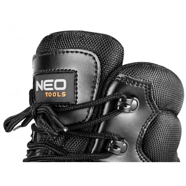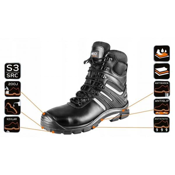 Trzewiki robocze S3 SRC, 82-175 marki NEO to wysokie trzewiki robocze w klasie S3 SRC, wyposażone w dwumateriałową cholewkę ze skóry pokrytej poliuretanem (action smooth lather) i tkaniną oxford, metalowe szlufki oraz elementy odblaskowe. Kompozytowy podnosek zapewnia ochronę przed uderzeniami z energią równą 200 J, a kevlarowa wkładka antyprzebiciowa chroni spód stopy. Buty posiadają zabudowaną piętę, profilowany tylnik, wzmacniany zapiętek, dwumateriałową podeszwę oraz odporność na oleje, benzynę i inne rozpuszczalniki organiczne. Charakteryzują się właściwościami antyelektrostatycznymi. Przepuszczalność i absorbcja wody w części piętowej jest zgodna z klasyfikacją obuwia bezpiecznego zgodnie z normą EN ISO 20345. Buty wyróżnia odporność na poślizg na podłożu ceramicznym pokrytym roztworem laurylosiarczanu sodu (SLS) oraz na podłożu ze stali pokrytym glicerolem. Trzewiki dostępne są w wielu rozmiarach.