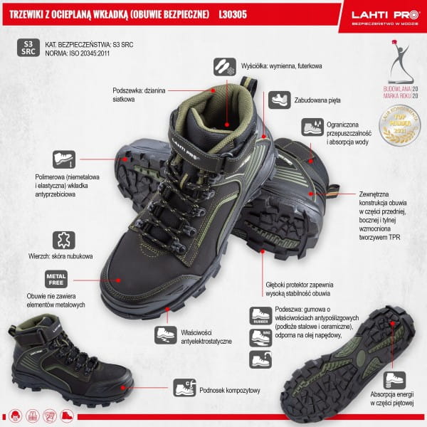 "Podszewka obuwia wykonana z dzianiny siatkowej oraz futerkowa wymienna wkładka. Podeszwa wykonana z poliuretanu dwugęstościowy o właściwościach antypoślizgowych na podłożach stalowych i ceramicznych jest również odporna na olej napędowy. Głęboki protektor zapewnia wysoką stabilność obuwia i komfort chodzenia. W trzewikach Lahti Pro zastosowano kompozytowy podnosek, antyprzebiciową wkładkę oraz właściwości antyelektrostatyczne. Trzewiki robocze Lahti Pro posiadają absorpcja energii w części piętowej i zabudowaną pięte. Ograniczona przepuszczalność i absorpcja wody. Obuwie nie zawiera elementów metalowych. Obuwie posiada kategorię bezpieczeństwa S3 SRC i spełnia postanowienia normy EN ISO 20345:2011. Każde obuwie marki Lahti Pro posiada deklaracje CE, jest w drugiej kategorii środków ochrony indywidualnej."