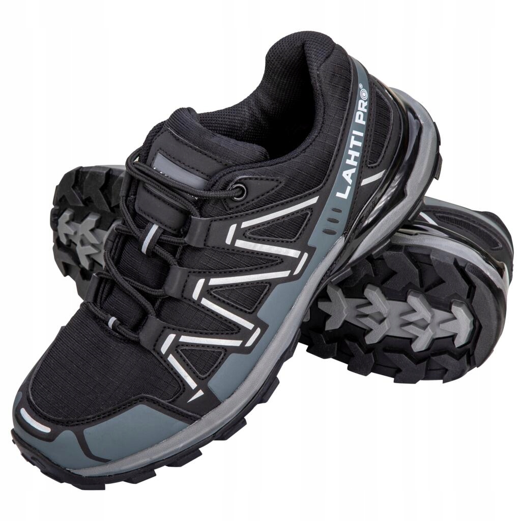 Półbuty robocze męskie Lahti Pro model L30434 wykonano z wodoodpornej dzianiny typu rip-stop. Podszewka która jest jednym z ważniejszych elementów w bucie ze względu na bezpośredni kontakt ze stopą wykonana jest z dzianiny siatkowej. Wyściółka buta roboczego zwana potocznie wkładką jest wymienna. Gumowa podeszwa o właściwościach antypoślizgowych na podłożu ceramicznym - norma bezpieczeństwa O2 - oraz głęboki protektor o nowoczesnej linii wzorniczej zapewniają wysoką stabilność obuwia i podnoszą komfort użytkowania. Półbuty robocze męskie o modelu L30434 posiadają właściwości antyelektrostatyczne. Zgodnie z normą SRA półbuty robocze mają zabudowaną piętę, ograniczoną przepuszczalność i absorpcję wody oraz absorpcje energii w części piętowej. Dodatkowo buty wyposażone są w elementy odblaskowe poprawiające widoczność. Obuwie posiada kategorię bezpieczeństwa O2 SRA i spełniają postanowienia normy EN ISO 20347:2011. Półbuty robocze Lahti Pro L30434 posiadają deklarację CE, obuwie jest w drugiej kategorii środków ochrony indywidualnej.