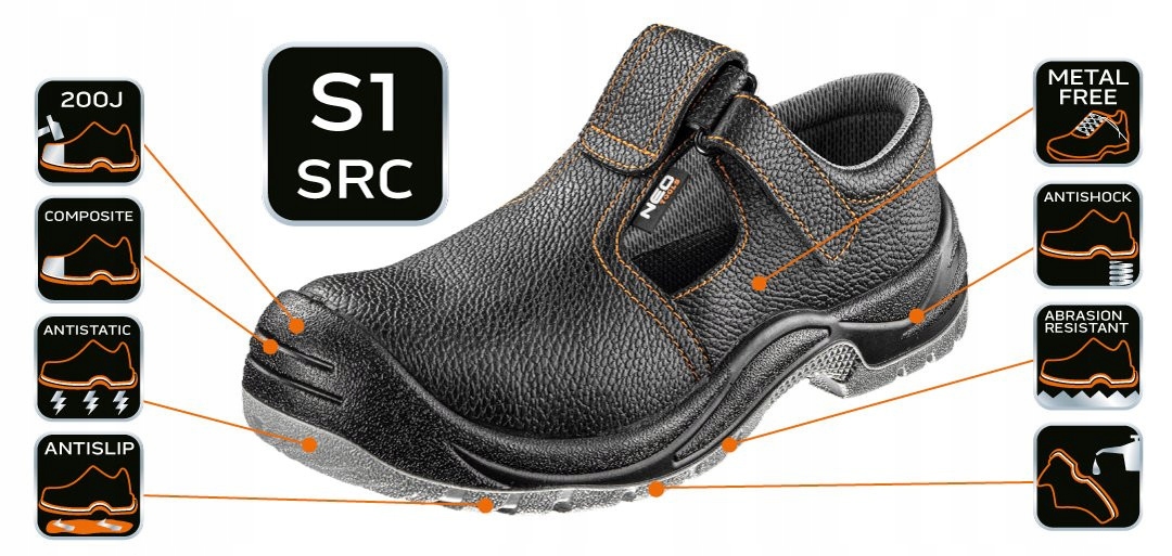 Sandały robocze NEO to podstawowa ochrona podczas pracy. Wykonane w kategorii S1 SRC (SRC- odporność na poślizg na podłożu ceramicznym pokrytym roztworem laurylosiarczanu sodu (SLS) i na podłożu ze stali pokrytym glicerolem). Wykonane z wysokiej jakości skóry z wycięciami zwiększającymi komfort pracy przy wysokiej temperaturze lub wewnątrz budynków. Antypoślizgowa podeszwa wyposażona w system amortyzowania wstrząsów, zapewnia bezpieczeństwo i wygodę. Wytrzymały podnosek z kompozytu chroni przed urazami mechanicznymi. Dzięki miękkiemu wykończeniu wewnątrz buta komfort pracy pozostaje na wysokim poziomie. Oznaczenie CE to gwarancja bezpieczeństwa, dowodzi, że produkt spełnia wszystkie unijne wymagania. Marka NEO spełnia oczekiwania profesjonalistów.