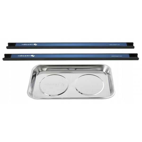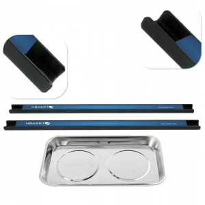 Zestaw dwóch listew magnetycznych do zawieszania narzedzi oraz miski do przechowywania drobnych elementów. Listwy pozwalaja przywiesic najczesciej uzywane narzedzia np. wkretaki, klucze, bity, szczypce. Mise mozna przyczepic do samochodu lub szafki warsztatowej, podnosnika kolumnowego i odkładac do niej róznorodne metalowe elementy np. sruby, podkładki, sprezyny, pierscienie itp. Zestaw jest przydatny w kazdym warsztacie.