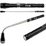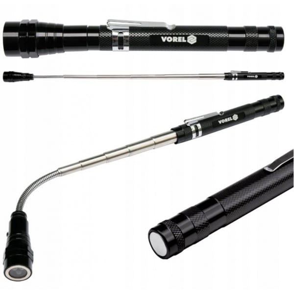 Aluminiowy chwytak teleskopowy z magnesem i funkcją latarki VOREL przydatny w warsztacie lub garażu.