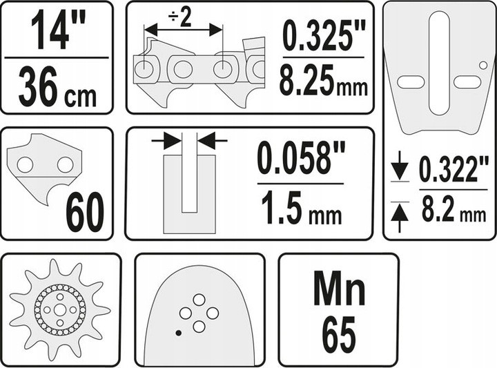 Długość 14", 60 ogniw, podziałka 0,325", szerokość 0,058" (1,5 mm).