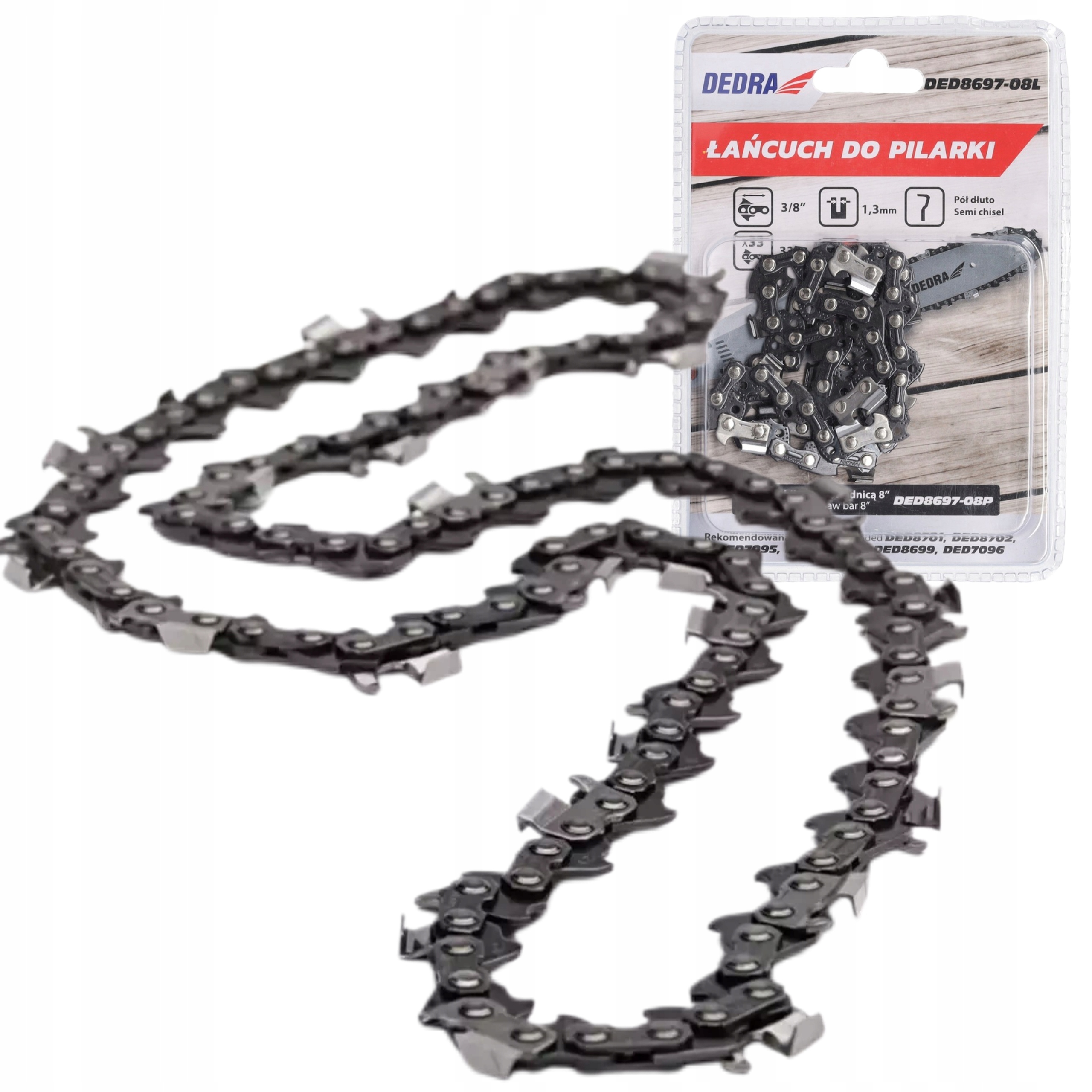 Zamienny łańcuch do pilarek łańcuchowych przeznaczonych do cięcia drewna. Łańcuch do prowadnic długości 8" 20cm, jest kompatybilny z większością pilarek na rynku. Szerokość rowka 1,3mm, podziałka 3/8", ilość ogniw 33,, profil półdłuta. Rekomendowany do produktów DEDRA