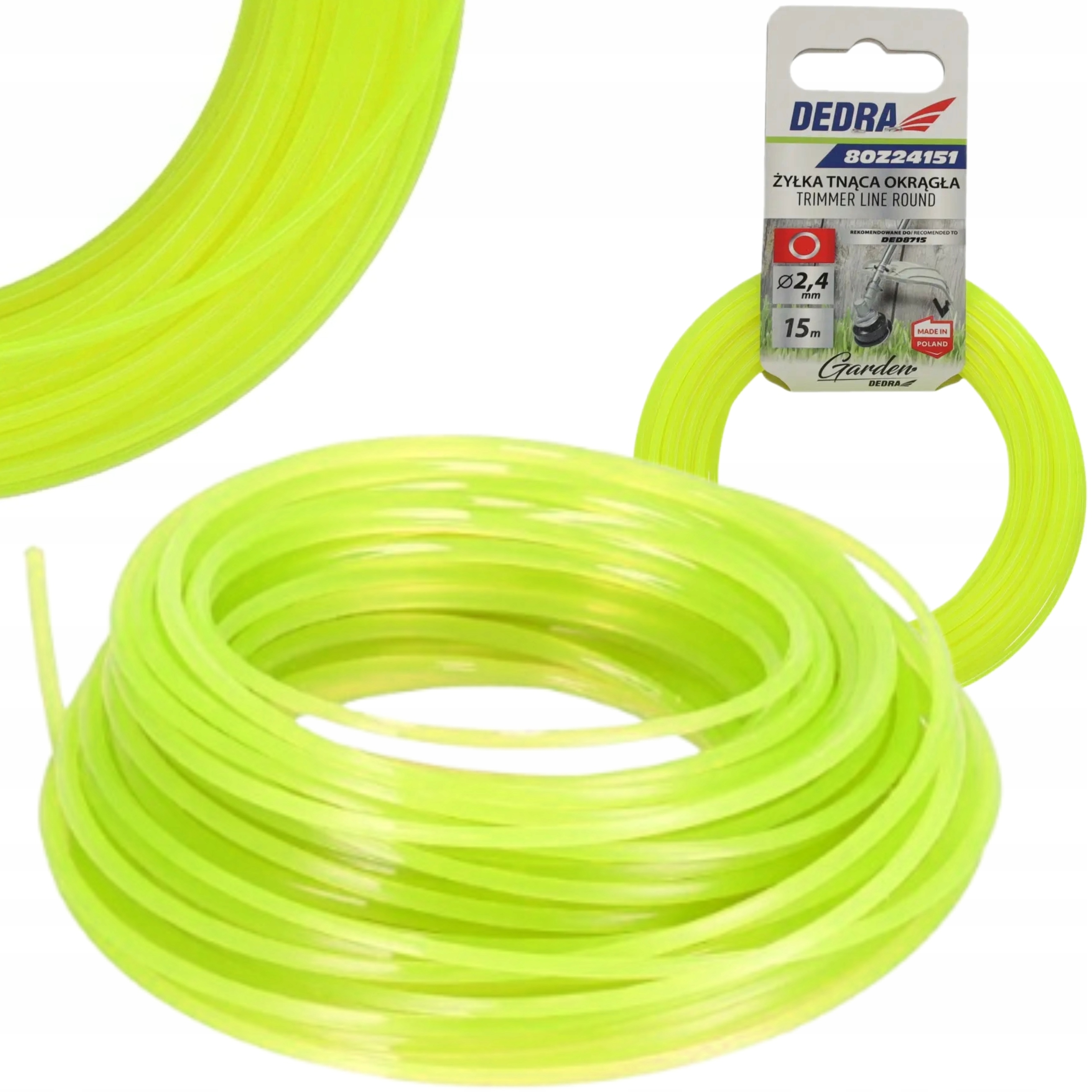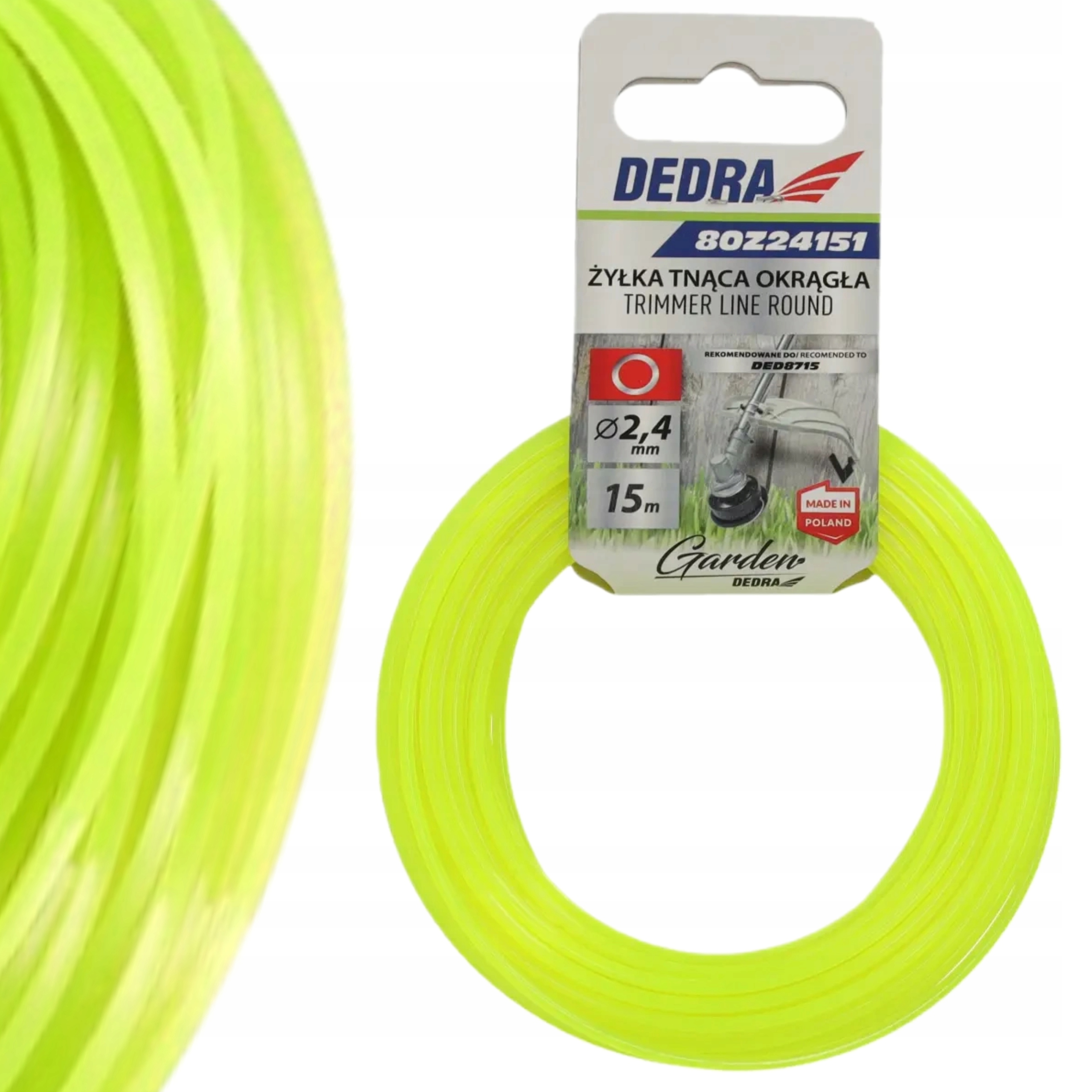 Żyłka tnąca o przekroju okrągłym, służąca do koszenia trawy, zarośli czy chwastów. Żyłka przeznaczona jest do pracy z kosami spalinowymi, podkaszarkami akumulatorowymi lub elektrycznymi. Żyłka wykonana została z bardzo odpornego materiału który zapewnia jej trwałość nawet podczas natrafienia na twardy materiał. Żyłka rekomendowana do kosy spalinowej model DED8715.