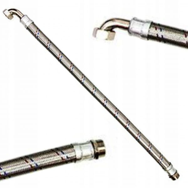 Wąż antywibracyjny, w oplocie stalowym zakończony kolankiem z nakrętką oraz łączem prostym zewnętrznym.