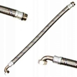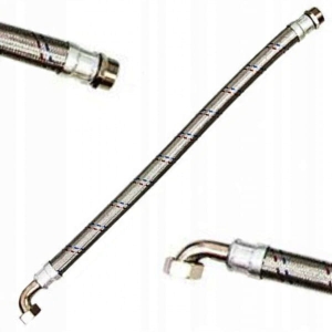 Wąż antywibracyjny, w oplocie stalowym zakończony kolankiem z nakrętką oraz łączem prostym zewnętrznym.
