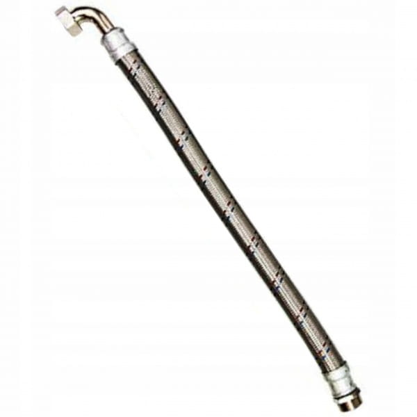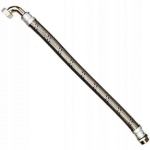 Wąż antywibracyjny, w oplocie stalowym zakończony kolankiem z nakrętką oraz łączem prostym zewnętrznym.
