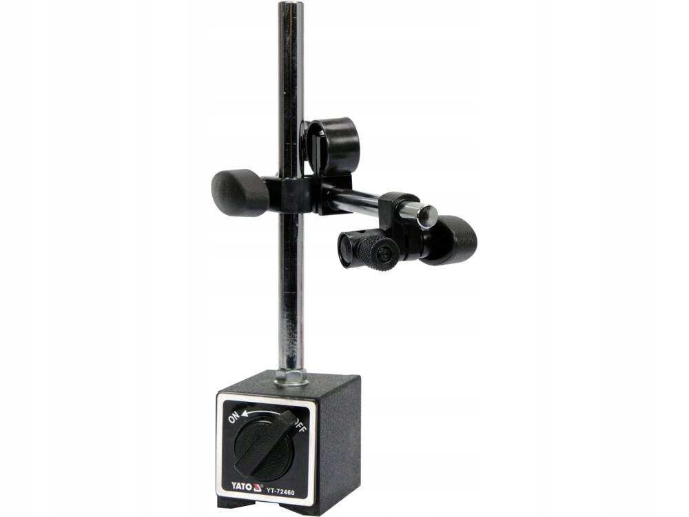 Profesjonalny statyw magnetyczny YT-72460 do czujników zegarowych YT-72450 i YT-72453. Posiada przegub sprężysty dla dokładnego pozycjonowania czujnika zegarowego na mierzonym elemencie. Centralne blokowanie pokrętłem jednocześnie środkowego i górnego przegubu. Podstawa magnetyczna z rowkiem pryzmatycznym od spodu. Duża siła przyciągania zapewnia stabilne i pewne połączenie z elementami metalowymi - odpięcie elementu realizowane jest specjalnym pokrętłem.