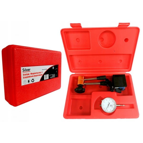 Zestaw pomiarowy do sprawdzania bicia tarcz: czujnik zegarowy + statyw automat + walizka do przechowywania