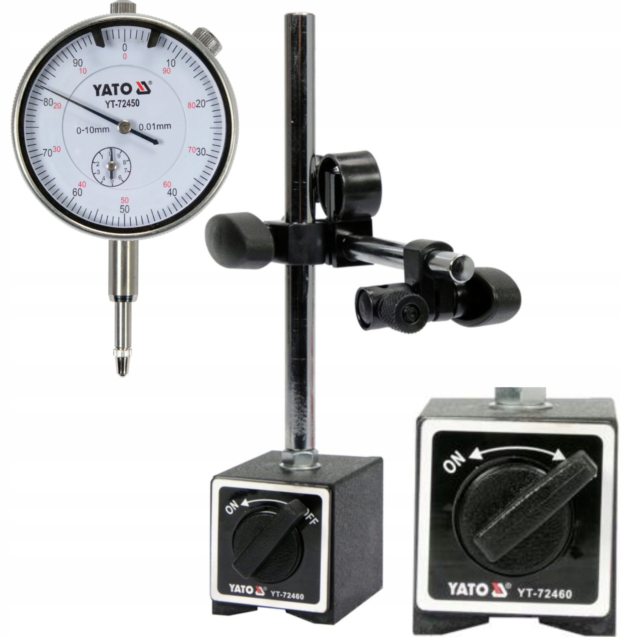 Profesjonalny statyw magnetyczny YT-72460 do czujników zegarowych YT-72450 i YT-72453. Posiada przegub sprężysty dla dokładnego pozycjonowania czujnika zegarowego na mierzonym elemencie. Centralne blokowanie pokrętłem jednocześnie środkowego i górnego przegubu. Podstawa magnetyczna z rowkiem pryzmatycznym od spodu. Duża siła przyciągania zapewnia stabilne i pewne połączenie z elementami metalowymi - odpięcie elementu realizowane jest specjalnym pokrętłem.