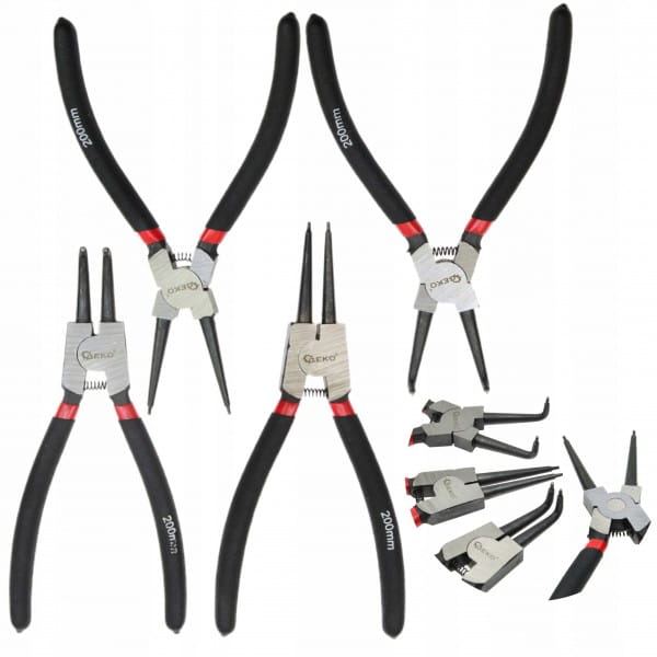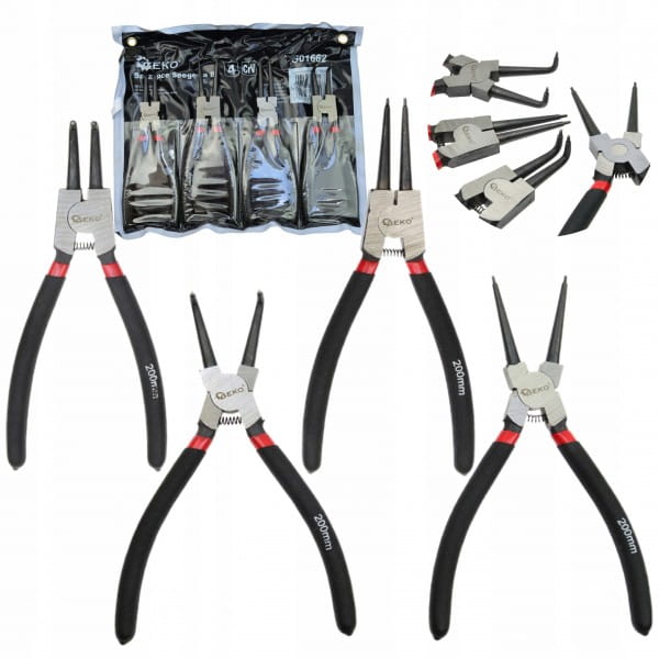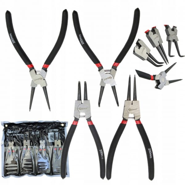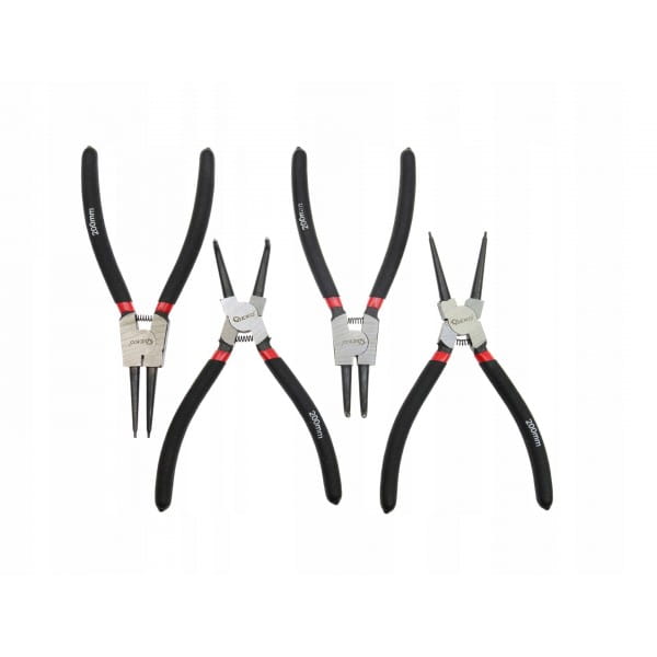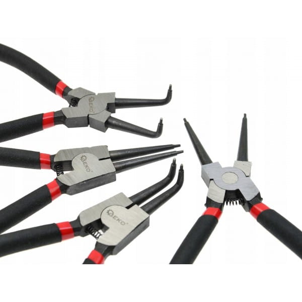 Zestaw szczypiec umożliwia montaż i demontaż wewnętrznych (rozprężne w środku tulei) oraz zewnętrznych (zaciskowe na zewnątrz wałka) pierścieni segera. W skład zestawu wchodzą 4 rodzaje szczypiec.