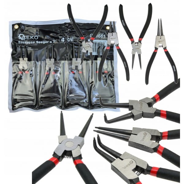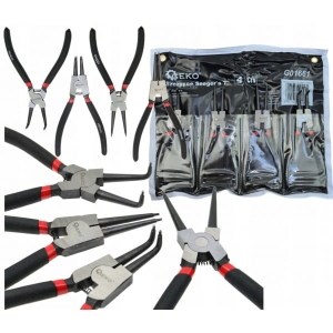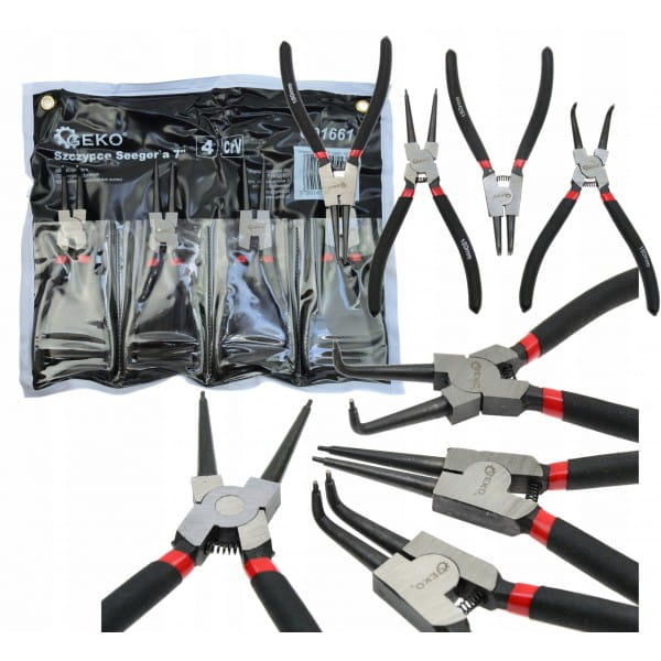 Zestaw szczypiec umożliwia montaż i demontaż wewnętrznych (rozprężne w środku tulei) oraz zewnętrznych (zaciskowe na zewnątrz wałka) pierścieni segera. W skład zestawu wchodzą 4 rodzaje szczypiec.
