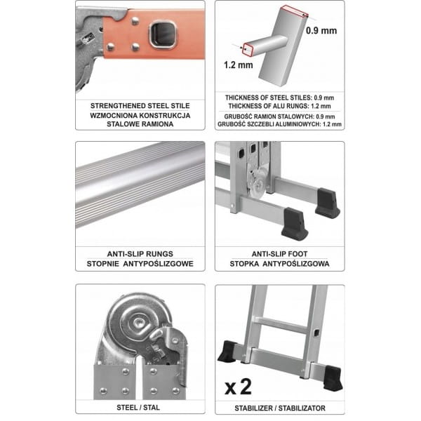 Podłużnice wykonane są ze wzmacnianych profili stalowych o grubości 0,9 mm, które są znacznie mocniejsze od aluminiowych. Wpływa to na zwiększenie stabilności i bezpieczeństwa oraz wydłuża żywotność drabiny. Szczeble aluminiowe wykonane są z profili o grubości 1,2 mm, które z każdej strony posiadają profilowane antypoślizgowe powierzchnie. Ponadto drabina zakończona jest dwoma szerokimi stabilizatorami znacznie zwiększającymi stabilność i bezpieczeństwo podczas użytkowania. Każdy stabilizator posiada dwie wyprofilowane stopki antypoślizgowe, które zwiększają przyczepność do podłoża w każdej pozycji rozłożenia drabiny.