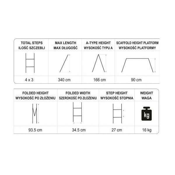 Drabina wielofunkcyjna 4x3 o wysokości max 3,4 m. Spełnia wymogi normy europejskiej PN EN131 o nośności na stopień 150 kg. Składa się z czterech segmentów połączonych mocnymi i wytrzymałymi przegubami. Wszystkie przeguby posiadają zamki ryglowe, umożliwiające bardzo szybką i wygodną zmianę ustawień drabiny w zależności od potrzeb. Dzięki temu możliwe jest rozstawienie jej w wielu pozycjach, m.in.: