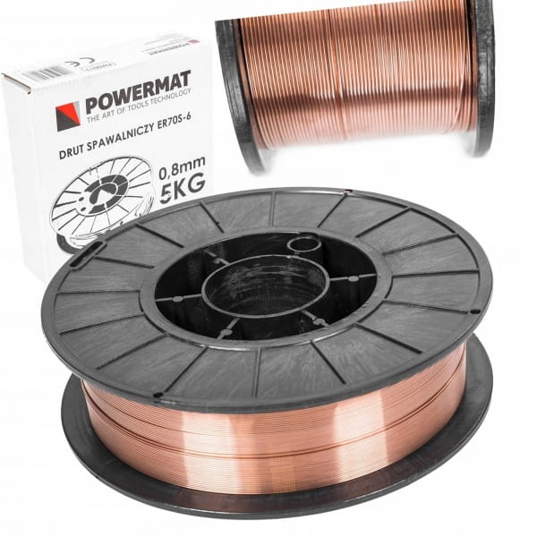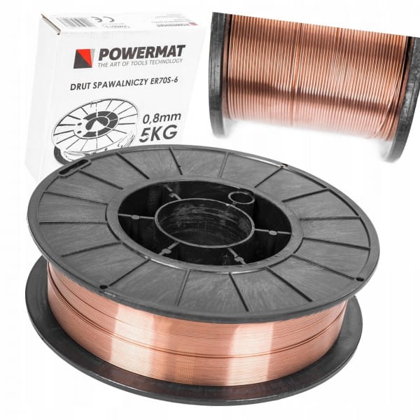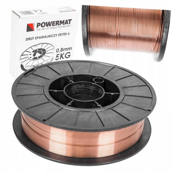Drut mangamowy Powermat o oznaczeniu ER70S-6. Grubość drutu 0,8mm. Jest to drut miedziowany z dodatkiem manganu, a także krzemu, który jest przeznaczony do spawania metoda MIG/MAG. Drutem tym możemy spawać stale niestopowe takie jak: stale przeznaczone do kotłów, stale konstrukcyjne, blachy i stale okrętowe oraz stali weglowo-manganowych w osłonie gazów. Stosujemy go także w warsztatach blacharskich przy spawaniu tłumików czy blach karoseryjnych. Można go stosować także do spawania cienkich blach o minimalnej granicy plastyczności mniejszej niż 420 MPa.