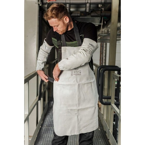 Fartuch spawalniczy skórzany 60 x 90 cm, bawełniane paski 81-891 NEO to niezwykle trwała odzież robocza polecana do stosowania w ochronie przed odpryskami, iskrami, drobinami stopionego metalu, krótkotrwałym działaniem płomienia z ciepłem kontaktowym czy promieniowaniem UV pochodzącym od łuku.