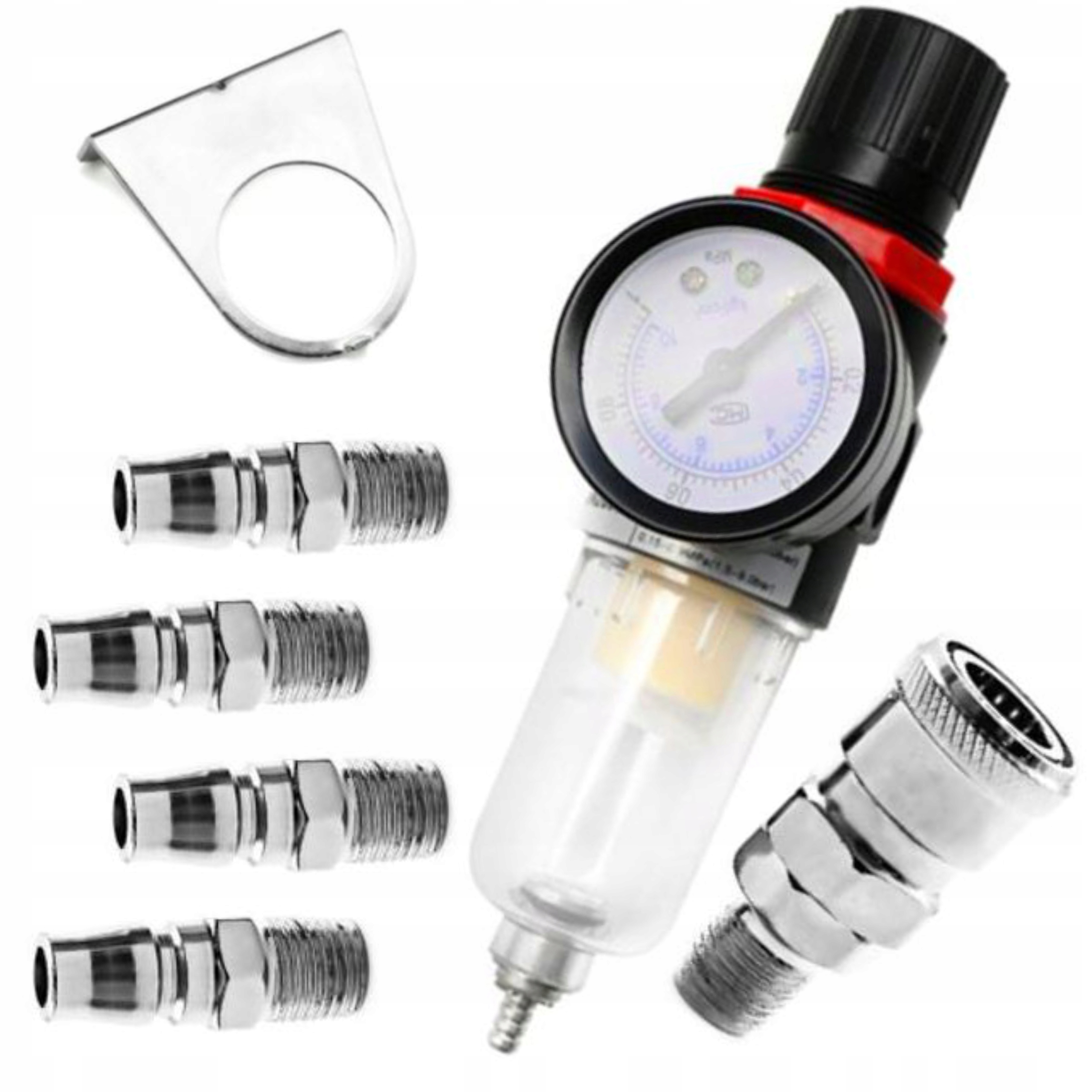 Reduktor ciśnienia do urządzeń pneumatycznych wyposażony w kompletny blok przygotowania powietrza. Precyzyjny manometr z podwójną skalną bar i PSI w osłonie szkiełka umożliwia stałą kontrolę ciśnienia.