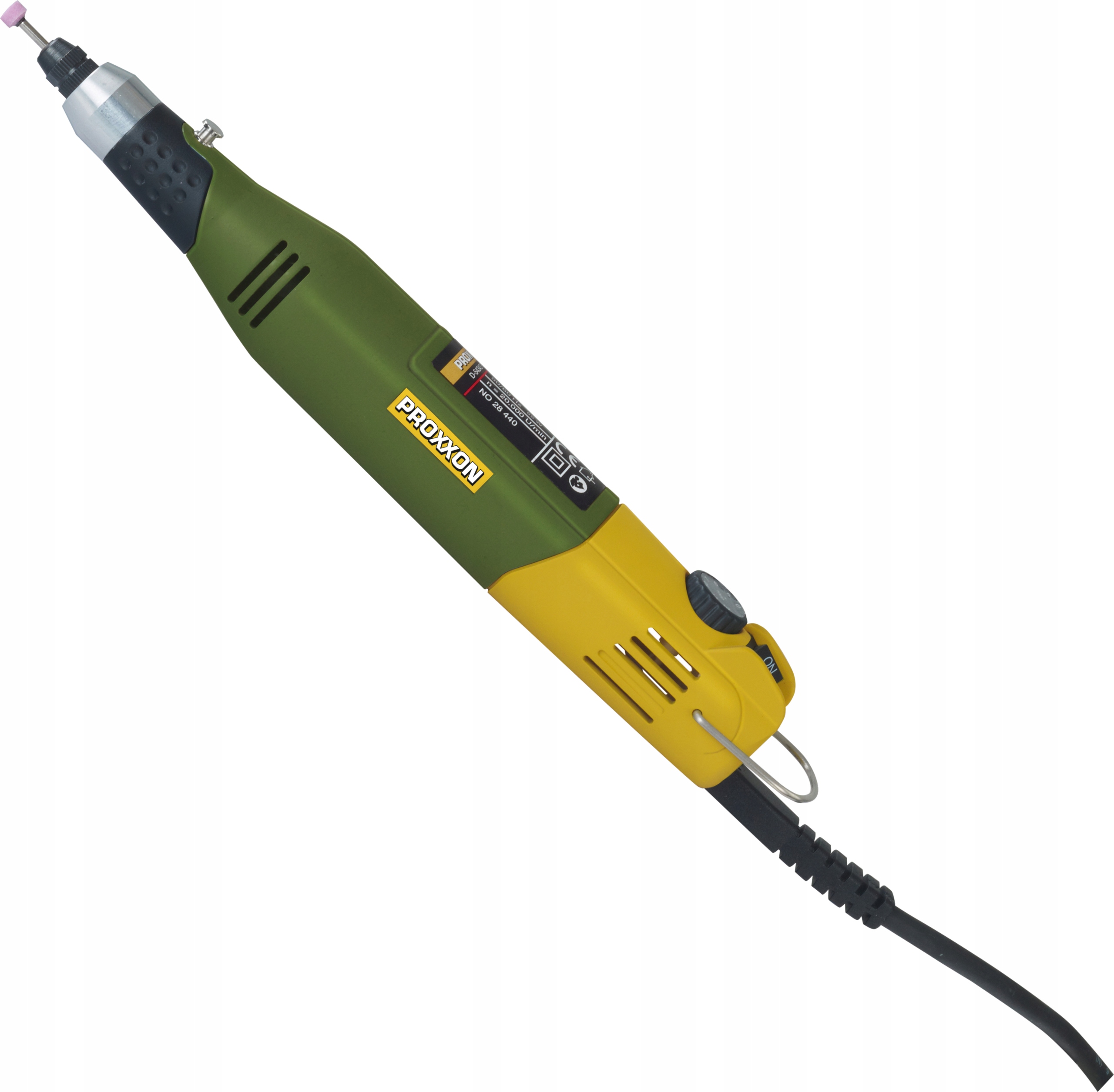 Do wiercenia, szlifowania, polerowania, czyszczenia, wycinania i grawerowania. Niespotykanie smukła obudowa ze wzmocnionego włóknem szklanym poliamidu z miękkimi wstawkami w obrębie uchwytu umożliwia operowanie urządzeniem przy pomocy dwóch palców (chwyt długopisowy). PROXXON MICROMOT 230/E posiada dobrze wyważony, cichy silnik na prąd stały o długiej żywotności. Maksymalna prędkość obrotów 20 000 obr/min może być płynnie zredukowana do 6 000 obr/min. Urządzenie posiada praktycznie ten sam moment obrotowy w niższym zakresie obrotów. Jest to szczególnie istotne przy precyzyjnym wierceniu, czyszczeniu czy też polerowaniu. Trzpień obraca się w łożysku kulkowym. Maszyna jest wyposażona w wysokiej jakości zaciski narzędziowe. Nawet najmniejsze wiertła, frezy itp. są bardzo pewnie trzymane, przez co wyeliminowane zostały jakiekolwiek „bicia”. Zarówno zakładanie jak i zdejmowanie osprzętu odbywa się poprzez naciśnięcie przycisku znajdującego się w okolicach uchwytu.