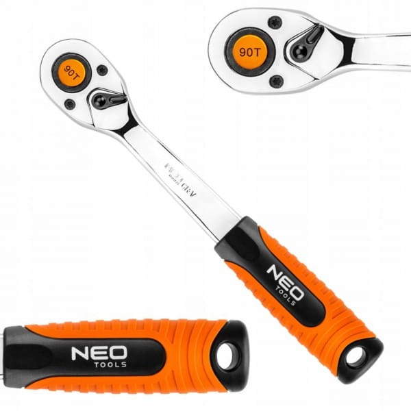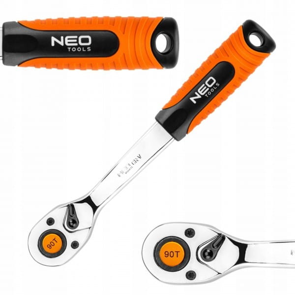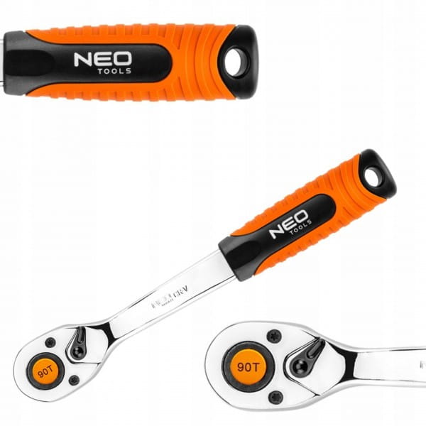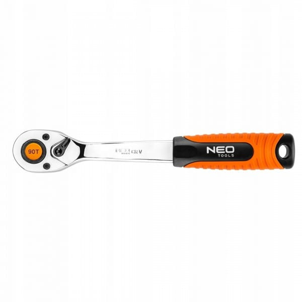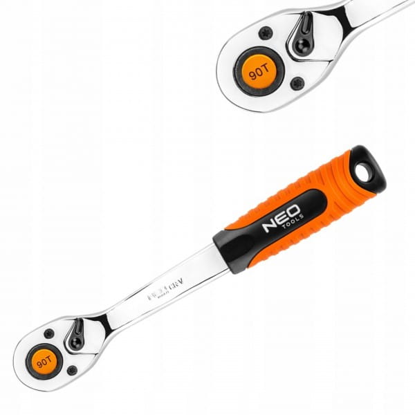 Grzechotka 1/2" NEO o długości 250 mm, z korpusem ze stali chromowo-wanadowej, wykonana zgodnie z normą DIN 3122. 90-zębowy mechanizm zapadkowy wykonany jest z wyjątkowo trwałej stali chromowo-molibdenowej, przedłużającej żywotność narzędzia. Ergonomiczny uchwyt dwumateriałowy poprawia komfort pracy. Jakość narzędzia potwierdzona certyfikatem TÜV i 25-letnią gwarancją producenta.