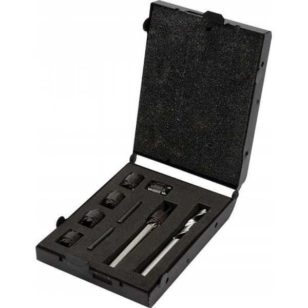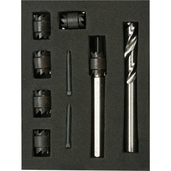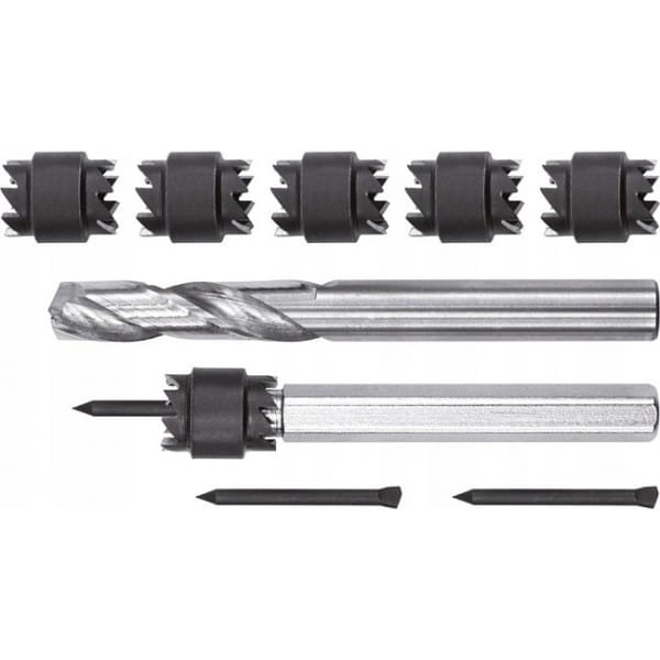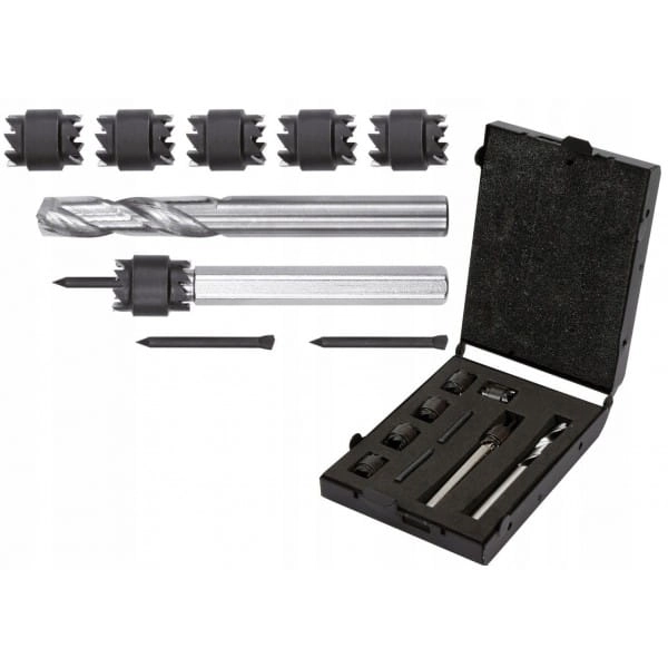 Profesjonalny zestaw przeznaczony do szybkiego usuwania zgrzewów, spawów, spoin karoserii samochodowej. Zawiera 6 dwustronnych frezów koronkowych, uchwyt mocujący, 3 trzpienie ustalające oraz specjalne wiertło HSS 8 mm.