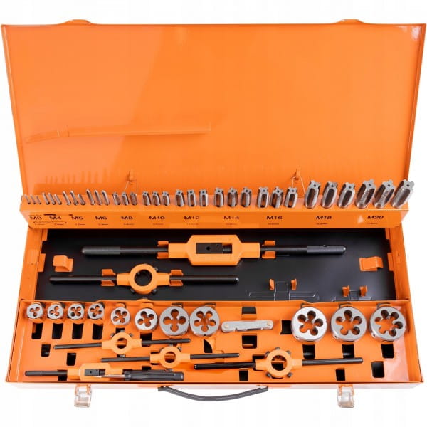 Komplet zawiera m.in.: gwintowniki, narzynki, pokrętła do gwintowników, oprawki do narzynek, gwintomierz oraz wkrętak.