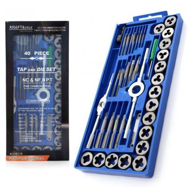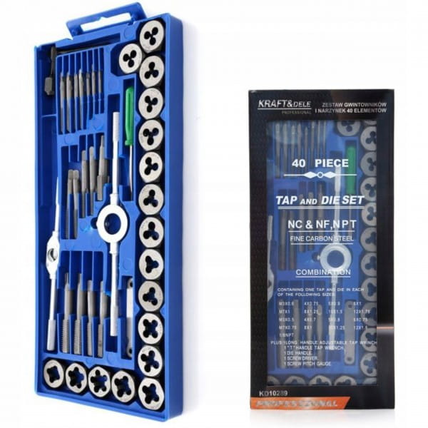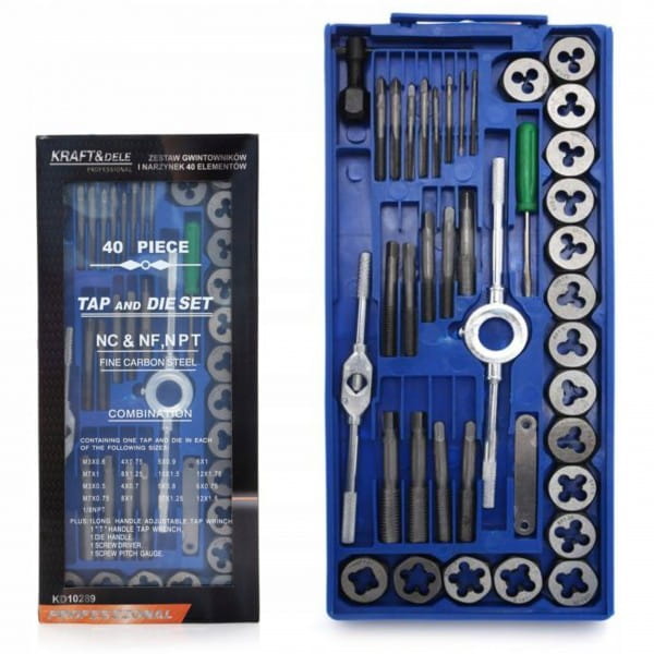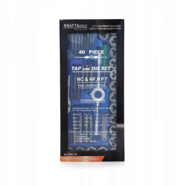 Profesjonalny zestaw gwintowników i narzynek polskiej marki Kraft&Dele i oznaczeniu KD10289. Wygodne w użyciu, bardzo dobrze wykonane narzędzia, niezastąpione w każdym warsztacie, domowym garażu czy zakładzie pracy. Zestaw służy do naprawy połączeń gwintowanych każdego rodzaju w większości materiałów. Wykonane z najwyższej jakości utwardzanej stali.