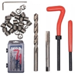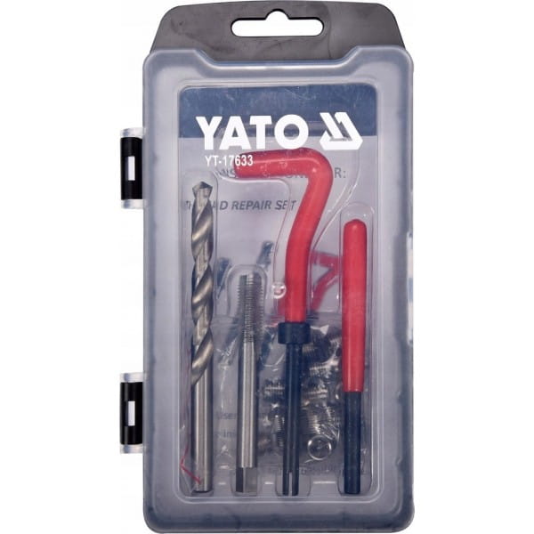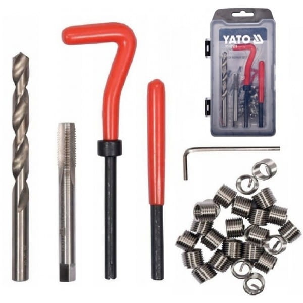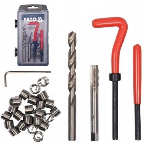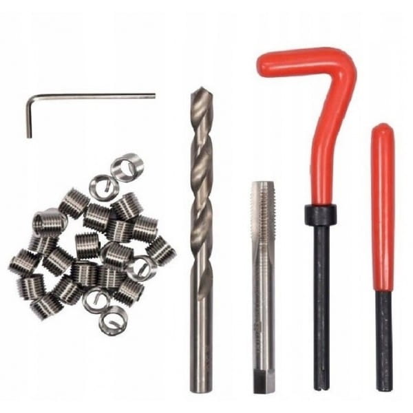 - Zawartość zestawu: gwintownik jednostopniowy do wykonania gwintu pod nową wkładkę, wkład spiralny x25 (M5x0.8), pokrętło do wkręcenia wkładek spiralnych, wybijak, wiertło do rozwiercenia uszkodzonego gwintu, klucz