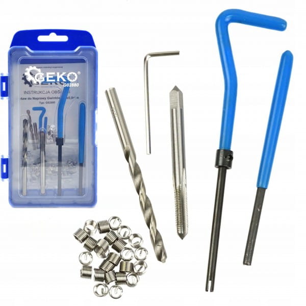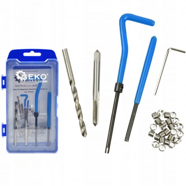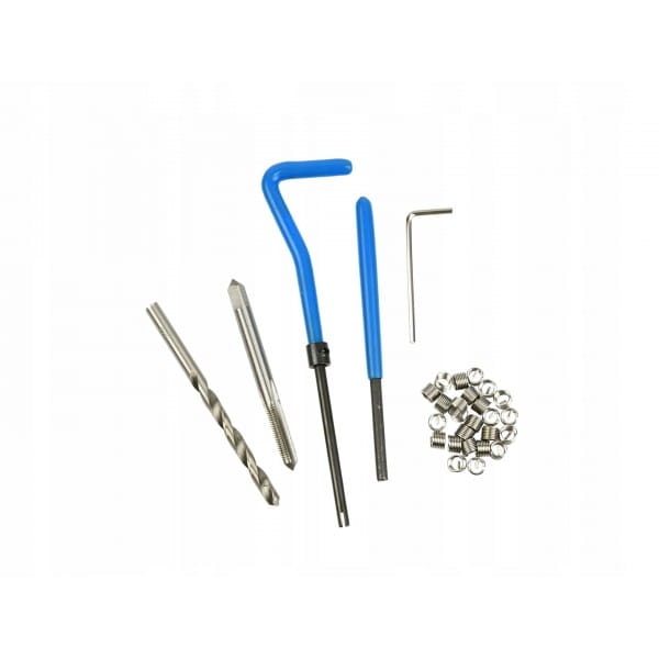 Zestaw przeznaczony do naprawy zerwanych i uszkodzonych gwintów M5x0,8mm. W skład zestawu wchodzi gwintownik i wiertło wykonane z wysokiej jakości stali szybkotnącej HSS4341, pokrętło prowadzące, wybijak oraz zestaw wkładek spiralnych.