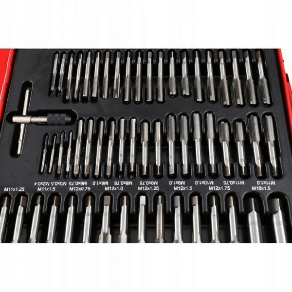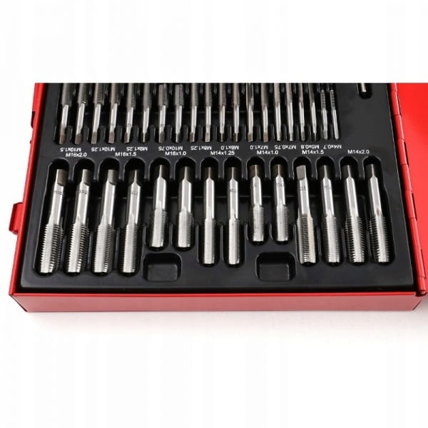 - 35 gwintowników stożkowych: M2X0,4mm; M3x0,5mm; M4x0,7mm; M5x0,9mm; m6x0,75mm; M6x1,0mm; M7x0,75mm; M7x1,0mm; M8x0,75m; M8x1,0mm; M8x1,25mm, M9x0,75mm; M9x1,0mm; M9x1,25mm; M10x0,75mm; M10x1,0mm; M10x1,25mm; M10x1,5mm; M11x0,75mm; M11x1,0mm; M11x1,25mm; M11x1,5mm; M12x0,75mm; M12x1,0mm; M12x1,25mm; M12x1,5mm; M12x1,75mm; M14x1,0mm; M14x1,25mm; M14x1,5mm; M14x2,0mm; M16x1,5mm; M16x1,0mm; M16x2,0mm; M18x1,5mm
