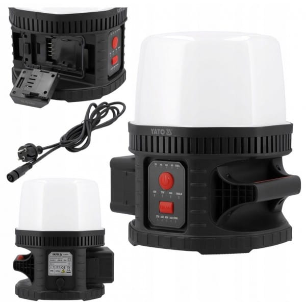 Reflektor pracuje zasilany sieciowo lub na akumulatorach platformy YATO 18 V. W przeciwieństwie do wielu innych modeli, które tracą moc w trybie sieciowym, lampa YT-829670 zapewnia tę samą intensywność światła (lumeny) niezależnie od źródła zasilania. Dodatkowo dzięki adapterom umożliwia pracę na akumulatorach innych typów.