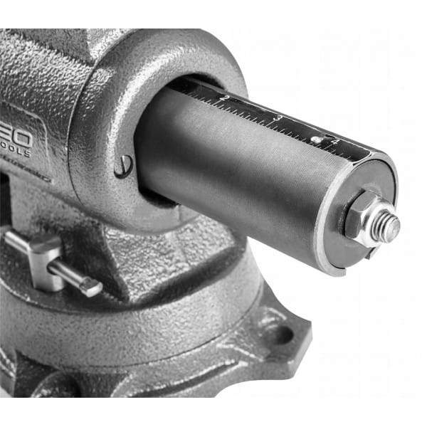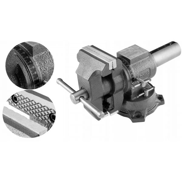 Wysokiej jakości imadło ślusarskie obrotowe 100 mm marki NEO, wyposażone w ruchomą głowicę 360 stopni oraz dwa rodzaje szczęk, umożliwiających zaciskanie zarówno obiektów kwadratowych jak i okrągłych. Narzędzie oferowane jest z kowadłem o parametrach 60 x 48 mm. Gwarantuje wysoką siłę zacisku i mocowania, określaną na poziomie 1500 kg.